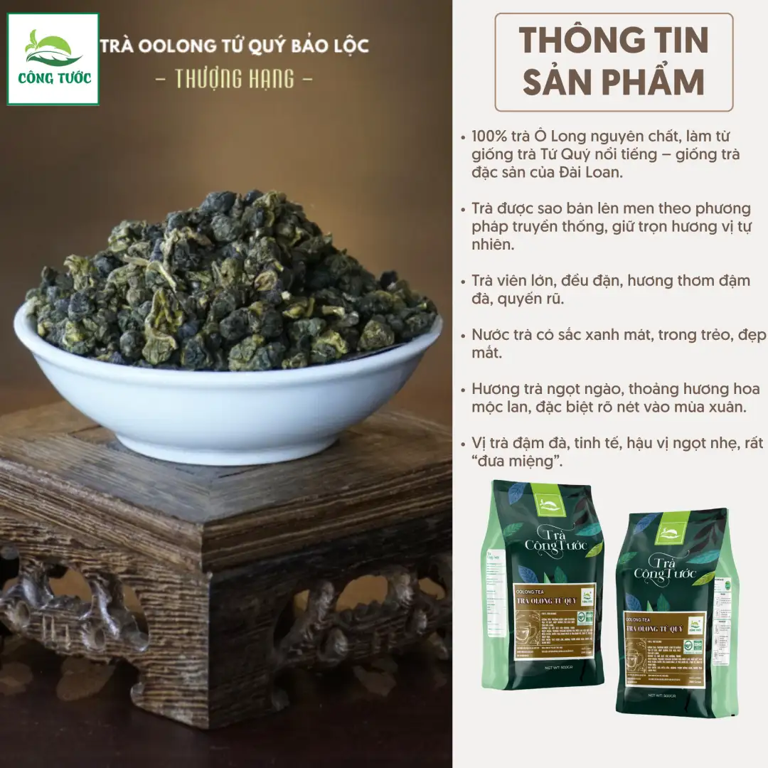 Thành phần: 100% trà Ô Long nguyên chất, giống trà Tứ Quý (Si Ji Chun).